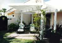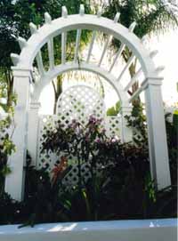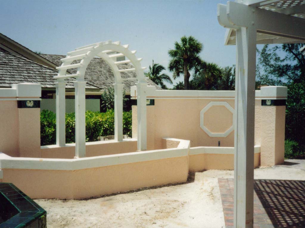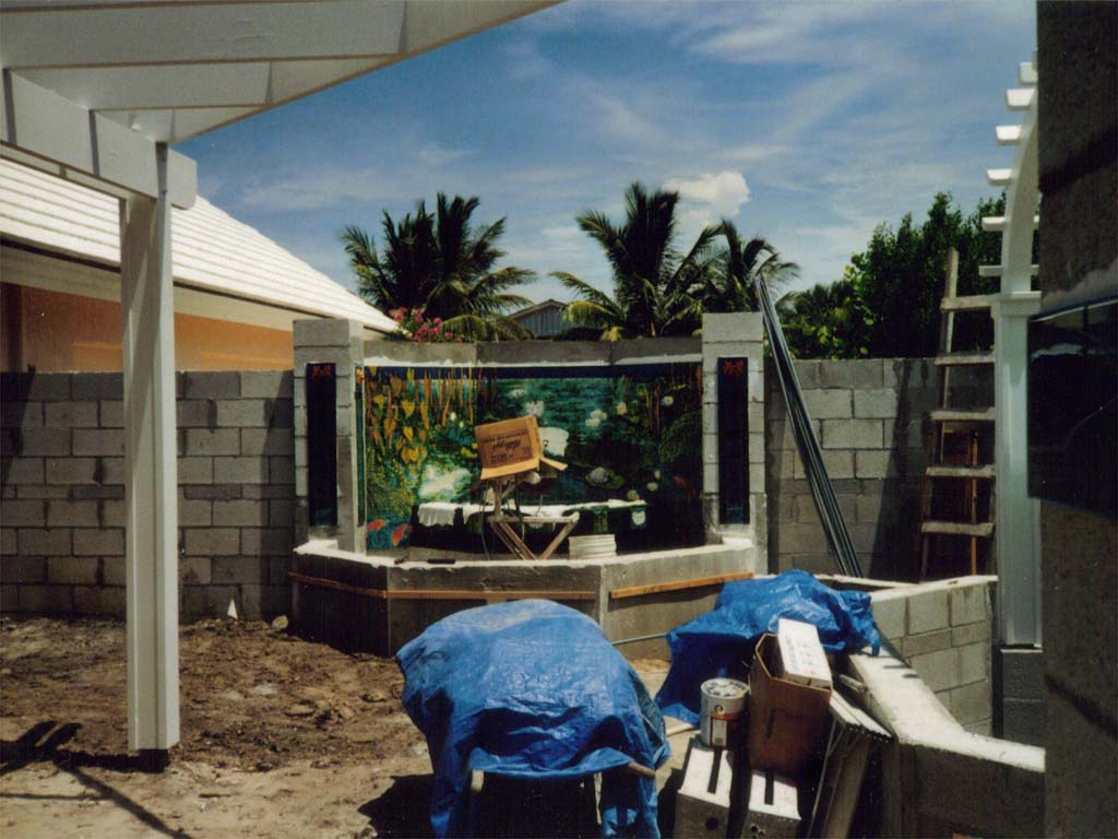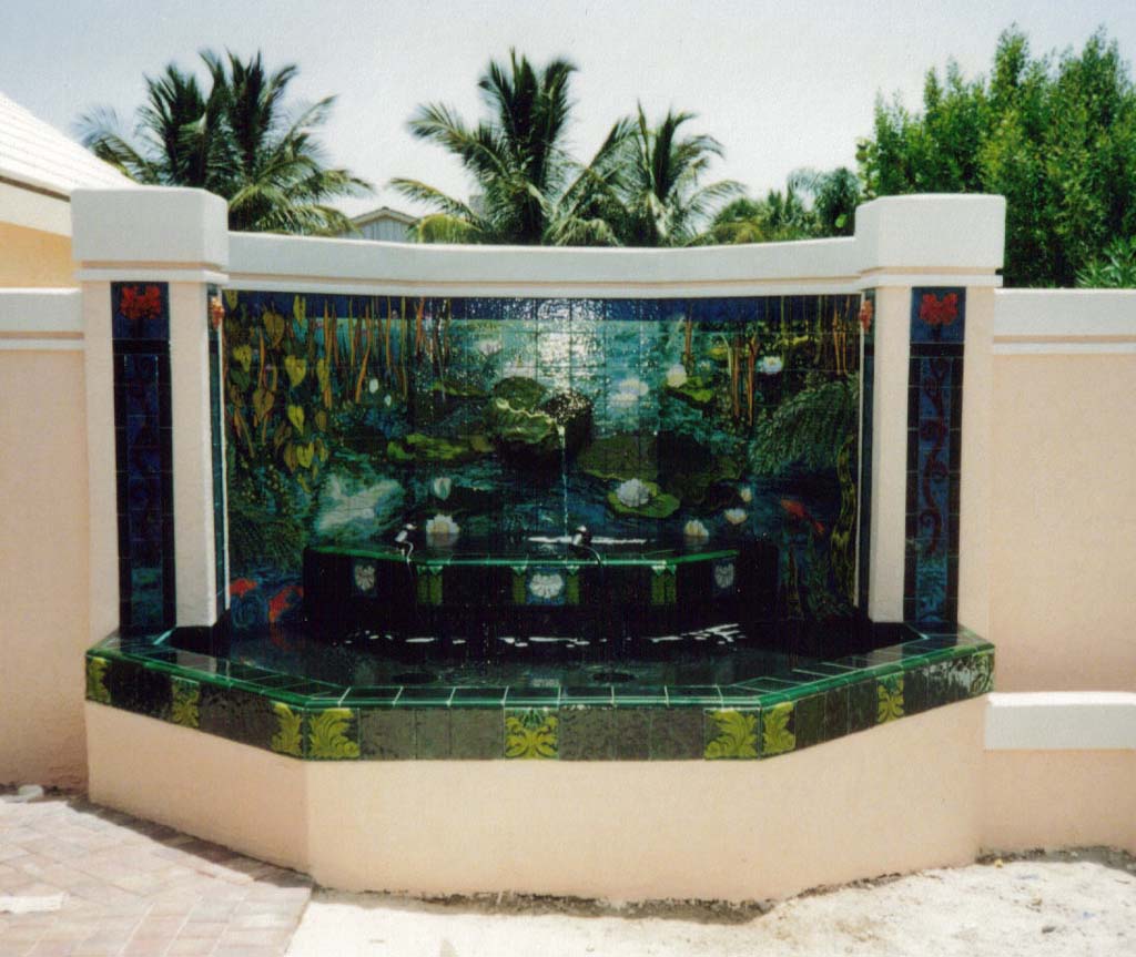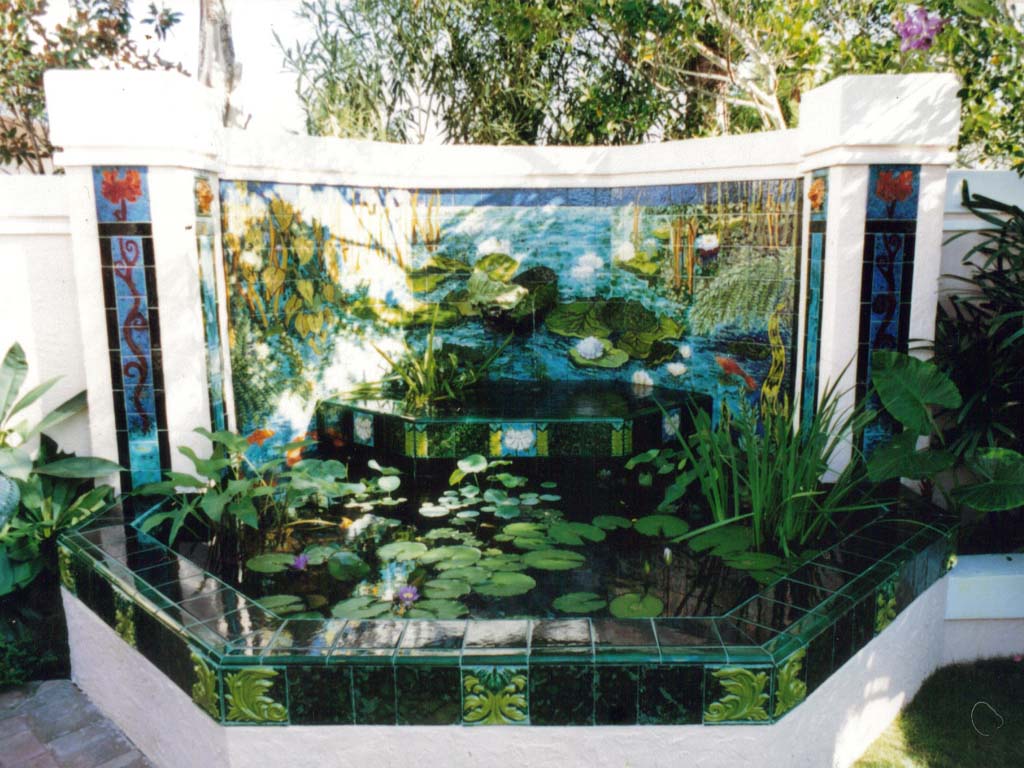 The concept for the Coburn garden was to create a relaxing and private garden area, surrounded by natural elements. Special features include a commissioned hand painted tile mural and fountain as backdrop for a two tiered koi pond. Colorful water lilies and tropical plants surround as one sits in the shade of the trellis.