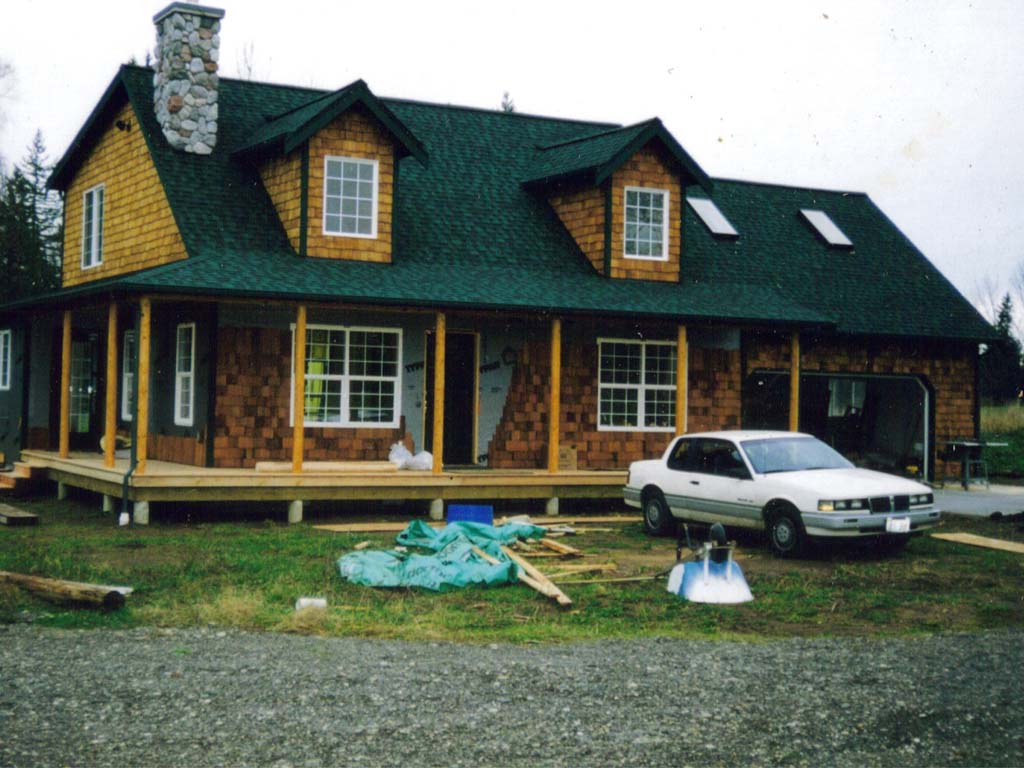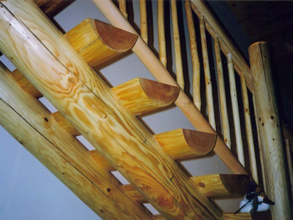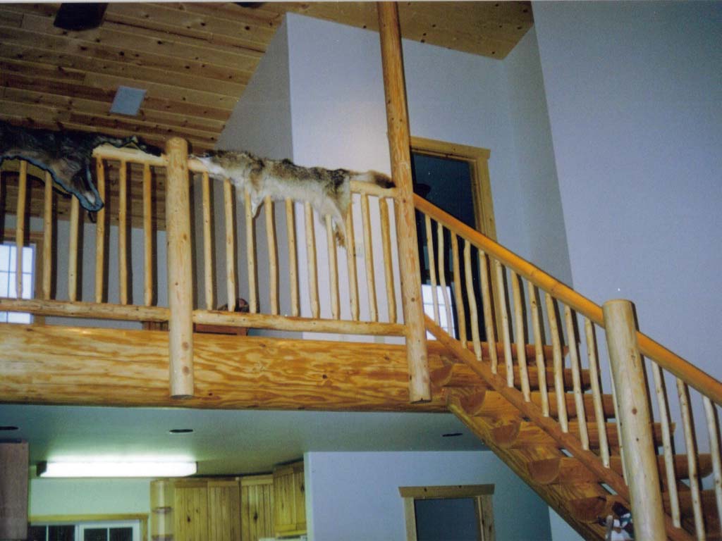 The Dahl home was designed to create the feel of a rustic log cabin with all the comforts of a modern home. Local Douglas fir logs were used for structural beams, stair case, and hand railings for stairs and loft. A natural river rock fireplace, hickory floors and kitchen, and cedar shingles on the exterior complete the package.