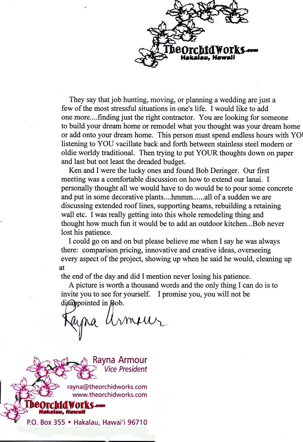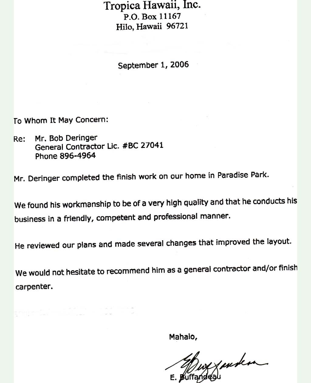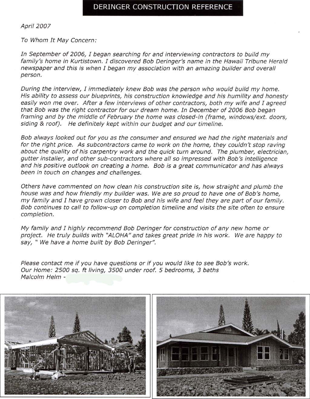 Contact Us For more information, or if you have any questions, please contact Bob Deringer Bus: 808-896-4964 Send email to bob@deringerconstruction.com.